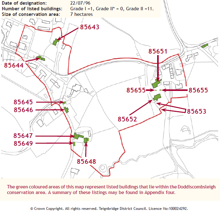 Part of the village consists of a Conservation Area, as shown below. This drawing has been taken from the TDC’s Doddiscombsleigh Character Appraisal which is one of the many Conservation Areas in Teignbridge district (see all of them here).